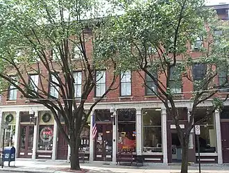 The building's earliest history is unknown. The oldest photograph dates to c. 1890, showing a "sample room", saloon, and a grocery or hardware store in the building. The second floor appears to have always been used for apartments. In the 1950s, a portion of the building held a grocery store operated by Adam Sauer. After a few years, Tony Shumick moved his own grocery into the building. In the mid-1970s, partners Fred Holdridge and Howard Burns established Hausfrau Haven, then a small market. The two stocked any items two or more customers would ask for; wine and The New York Times were especially popular. The store operated every day except January 1, when community members and customers would help them take inventory. The store was also noted for its witty signs, including those reading "Unattended children will be sold!" and "We will not be taken over by The Limited!".[1]