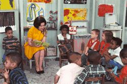 First Lady Lady Bird Johnson visits a Head Start class in 1966