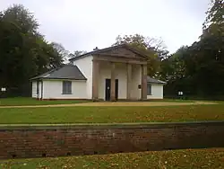 Designed by James Wyatt in 1800 for Thomas Egerton, 1st Earl of Wilton, the ornamental temple is a simple, small rotunda of Tuscan columns with a domed roof and lantern. This Grade II listed building stands on the highest point of the city of Manchester giving views across the golf course, which was originally the deer park.[29] It has its own fireplace and is thought to have been used as an observatory by the Earl who is known to have owned a telescope bought from Dollond's of London. The cost of the telescope was £18.5s.0d (£18.25) – the same amount earned in a year by the Earl's under-butler. The temple has recently been enclosed by a stone balustrade and gravelled path and is used as a summer studio for artists, and for astronomy sessions.[12]