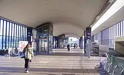 At its inauguration in 1955, the station building was criticised by some as a "glass case of inaccessibility."[28] A later commentator commended the concourse hall for its "architectural and operational excellence”.[29] The long glass facades have an “elegance and lightness"[30] previously unknown in railway buildings and they were said to correspond to the "ideals of the architecture of the 1950s: transparency, lightness and spaciousness." Here, the modernity of the glass facade stands in contrast to the vertical structure of the reception hall façade with its relatively strong, neo-classical concrete roof supports, according to a publication of the State Historical Monuments Office (Landesamt für Denkmalpflege) of Baden-Württemberg in 2010.[26]