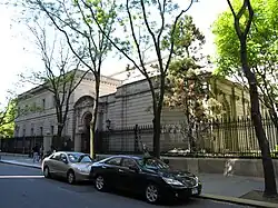 The site had been part of the Lenox family's farm until the late 19th century.[14] The site of the Frick House then became the Lenox Library, designed in a neo-Grec style by Richard Morris Hunt. The library had contained paintings and books owned by the philanthropist James Lenox.[15][16] Frick's house occupies a 200-by-175-foot (61 by 53 m) site that includes both the library and an adjacent strip.[6][7] The eastern half of the block was sold to other developers,[17] who had erected residences there by 1910.[18] The entire block was restricted to residential use until 1929,[18] although the Frick House was excluded from this restriction in 1926.[19] After the mansion became a museum, its site was expanded to include the land occupied by the Widener House at 5 East 70th Street (built in 1909 by Warren and Wetmore); 7 East 70th Street (built in 1911 by C. P. H. Gilbert);[20] and a third house at 9 East 70th Street (built in 1915).[21]