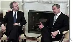 McLeish travelled to the United States in April 2001 where he met with President of the United States, George W. Bush, in the Oval Office at the White House.[40] The following day, McLeish was criticised over his decision to appointment a Scottish ambassador to Washington D.C. which was described as "a threat to the future of the United Kingdom". McLeish announced that the role of the ambassador in the United States would be largely promoting Scotland and its image in the United States.[41]