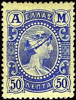 The first type of the Greek stamp is named "large Hermes head" in order to differentiate it from the following one, issued in 1886, and named "small Hermes head".[13]