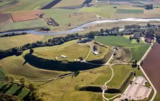 The Aussensiedlung (German: exterior settlement) was located downslope, immediately to the west and northwest of the citadel. It was probably occupied from the 7th century (Hallstatt period) to the 5th century BC. It appears to have existed as a separate fortified settlement. The Aussensiedlung covered up to 100 hectares, many times the area of the citadel proper. It appears to have consisted of separate fenced or palisaded lots, each containing a main dwelling, storage areas and much terrain for fields. It is suggested that each of the lots functioned as a separate farmstead, supporting an extended family. A population of 5,000 to 10,000 individuals is estimated just for the Aussensiedlung. The area enclosed could never have sufficed to produce the amounts of food necessary to feed such a population.[18] The Giessübel mounds (see below) are erected on top of the remains of part of the Aussensiedlung and must thus postdate it.