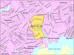 - ^ Barron, James. "IF YOU'RE THINKING OF LIVING IN: FIVE TOWNS", The New York Times, July 10, 1983. Accessed May 20, 2008. "The basic five are Lawrence, Cedarhurst, Woodmere, Hewlett and Inwood. But the area also includes some unincorporated communities and two tiny villages, Hewlett Bay Park and Woodsburgh, that are not added to the final total."