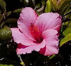 Hibiscus × rosa-sinensis, known colloquially as Chinese hibiscus,[3] China rose,[3][a] Hawaiian hibiscus,[3] rose mallow[4] and shoeblack plant,[5] is a cultigen of tropical hibiscus, a flowering plant in the Hibisceae tribe of the family Malvaceae. It is an artificial hybrid created in cultivation in pre-European times by Polynesians in the west Pacific from the species Hibiscus cooperi and H. kaute (native to Vanuatu and the French Polynesia, respectively). It is widely cultivated as an ornamental plant in the tropics and subtropics. The hibiscus is the national flower of Malaysia, where it holds official status, and is also considered the unofficial national flower of Haiti.