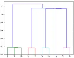The clustering procedure has correctly identified that series 9 and 10 where perturbations of series 2, hence (9,2,10) are clustered together. Similarly, 7 is a perturbation of 1, 6 is a perturbation of 3, and 8 is a perturbation of 5. The only original item that was not perturbated is 4, and that is the one item for which the clustering algorithm found no similarity.