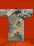 Hikeshi banten is a reversible hanten coat worn by hikeshi, Japanese firefighters of the Edo period, often decorated with symbolic images. Firefighter brigades consisted either of samurai (buke hikeshi) or commoners (machi hikeshi). The coats were made of multiple layers of tightly stitched cotton fabric, quilted using the sashiko technique of running stitches. On one side, the coats had only the firefighting brigade name. The other side featured elaborate designs "resist-dyed using the tsutsugaki method". The inner designs often depicted warrior heroes, or mythical creatures associated with bravery or water, often inspired by ukiyo-e prints.[1][2][3]