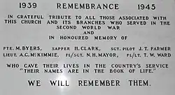 Either side of the founding parishioners plaque are commemorations of Hillhead Baptist Church congregations who died in the 1914–18 and 1939–45 wars. Totally 32 parishioners died in the 1914–18 war, one of whom, Captain Watson T Dick received the Military Cross, and 6 died in the Second World War.