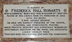 Rev. F.H. Robarts began his ministry in 1883 [to Hillhead Baptist Church], and continued until his death in 1901. His was an [sic?] unique ministry, and his influence far beyond that exerted by a Baptist Pastor in a community predominantly Presbyterian. Sittings were soon with difficulty obtainable, and crowded congregations waited on his words, queues being not uncommon. His saintly and gracious personality is still a precious memory to the older members of the congregation, and those of middle age who as children listened to his wonderful children's sermons will cherish the recollection of them.