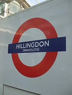 The current station roundel still has its original station name. "Swakeleys" is a reference to the nearby junction on the A40 Western Avenue.