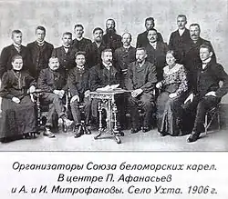 In 1906, the Union of White Sea Karelians (Finnish: Wienan karjalaisten liitto) was created. The Union's main goal was to improve the life of the common Karelians and additionally develop their own national identity.[10] The union was temporarily dissolved in 1911 after series of repressions done by the local government.[11]