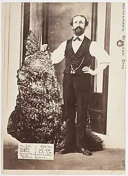 Hill End, also near Bathurst NSW was a locality that grew, boomed and faded with the New South Wales Gold Rush. Called Bald Hills in 1850, Forbes in 1860 and finally Hill End in 1862, it was part of the Tambaroora district. At its peak, its population was 7,000. Completely reliant on mining, the town's decline was dramatic once the gold ran out. Hill End is famed for the unearthing of the Holtermann Specimen (also known as the Beyers-Holtermann Specimen), being the largest single mass of gold ever discovered in the world, a record that stands today. Found in 1872 at the Star Hope Mine, this single mass of quartz and gold weighed 630 pounds (290 kg) and when crushed produced an estimated 3,000 troy ounces (210 pounds; 93 kilograms) of gold, thus holding more processed gold than from the largest nugget ever found, that being the Welcome Stranger from the Victorian Goldfields. Holtermann recognising the significance of the find attempted to preserve it by buying it from the Company of which he was one of a number of directors. His efforts were in vain. It is reported that a larger mass was discovered a few days later in the same mine but was broken up underground.