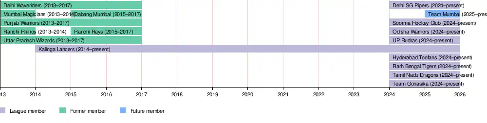 Before the beginning of the second season, Kalinga Lancers were announced as the sixth team in the Hockey India League.[15] However, after the 2014 season, the league suffered its first setback when the Mumbai Magicians disbanded.[16] The team was swiftly replaced though with Dabang Mumbai being launched before the 2015 season.[17] The league though suffered another setback before the 2015 season when Ranchi Rhinos, the inaugural champions, were disbanded after an ownership problem. The team though, like with Mumbai, was quickly replaced with Ranchi Rays.[18][19]