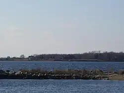 Hog Island is an American island in Narragansett Bay in Rhode Island. It lies at the entrance to the harbor of Bristol and is part of the town of Portsmouth. The 60 ft (18 m) tall Hog Island Shoal Lighthouse stands off the south end, warning ships of the dangerous shoals around the island. It has a land area of approximately 0.3 sq mi (78 ha; 190 acres), making it the fifth-largest island in Narragansett Bay. It is home to a small summer vacation colony, with no regular year-round residents, and there are approximately 100 homes on it.