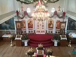 The Holy Resurrection Orthodox Church was designed by John Bergesen, an architect from New York City. The church was built with six onion domes, which was common in Russian architecture of that period. The dimensions of the church are 36 by 63 feet (11 by 19 m), which does not include the main entrance, and a height of approximately 100 feet (30 m). The inside of the church is divided into three parts: the vestibule, the nave, and the sanctuary.[2] Its icons were some of the last ones to leave Russia before Czar Nicholas II was overthrown.