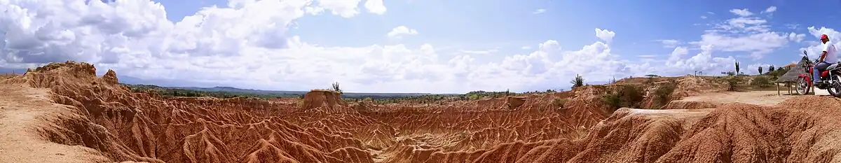 Today, the sediments of the Honda Group are exposed in the Middle (Valle Medio del Magdalena, VMM) and Upper Magdalena Valley (Valle Superior del Magdalena, VSM) in an intermontane valley between the Central Ranges in the west and the Eastern Ranges in the east. The valley in between the two major orogenic chains is filled by the Magdalena River, the longest river of Colombia. The Upper Magdalena Valley geologically is subdivided into the Neiva Sub-basin with the Girardot Sub-basin of the southernmost Middle Magdalena Valley to the north, divided by the Natagaima Arch.[6] The Neiva Sub-basin is bound by the Chusma Fault in the west and to the east by the west-verging Garzón Fault.[7] The Mulato-Getudo Fault possibly underlies the Honda Group south of the La Miel River.[8] The Tatacoa Desert, where the type section of the Honda Group has been redefined is an unusually dry region in Colombia, caused by a mountain induced rain-shadow effect. In Middle Miocene times, the geography was more comparable to the present eastern foothills of the Andes.[9]