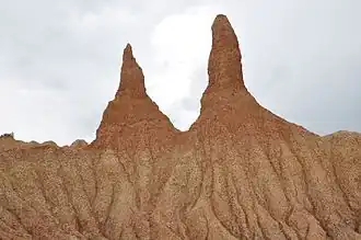 The contact between the Villavieja Formation and the underlying La Victoria Formation is concordant.[18] The basal part of the Villavieja Formation comprises siltstones and claystones that also form the bulk of the formation with 75 percent. The remaining quarter is composed of conglomeratic sandstones. The thickness of the siltstones and claystones can exceed 8 metres (26 ft) and have interspersed fine- to medium-grained 10 centimetres (3.9 in) thin sandstone beds. The fine sediments of the Villavieja Formation are coloured greenish, reddish-brown or bluish-grey and display weathering patterns in so-called "cauliflower erosion" structures. The light grey coarser beds, up to conglomeratic sandstone size, do not exceed 2.5 metres (8.2 ft) in thickness and commonly show a lateral transition with the silt- and claystones. The Baraya Member of the Villavieja Formation shows thin yellowish and reddish brown sandstone and siltstone levels with volcaniclastic grains.[20]