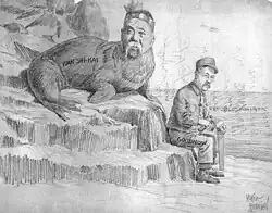 China's reassertion of suzerainty over Korea aggravated the split between pro-Japanese Korean progressives and pro-Chinese conservatives. In December 1884 the progressives attempted to form a new government with Japanese backing during the Gapsin Coup, and the conservatives led by Queen Min turned to the Chinese garrison for help. Yuan led his troops to defeat the outnumbered Japanese and recover King Gojong. The 26-year-old Yuan established himself as a resourceful leader, and from that point Viceroy Li Hongzhang gave him a critical role in regaining Chinese control of Korea.[16] In October 1885, Yuan was appointed Chinese imperial resident in Korea by Li,[16][17] restoring a custom that dated back to the Mongol Yuan dynasty.[18] Yuan Shikai spent the next nine years in that position[16] and operated as if he were above the law.[18] He ended any attempts at reform, changed the composition of the Korean government, and worked to minimize any other foreign influence, especially Japanese. Yuan was allied to the corrupt Min oligarchy, and historians have characterized his reign in Korea as a "dark age."[18] His behavior and rule created a lot of antagonism against him and China among Koreans.[16][19] However, during those years China was able to maintain its control over Korea and contain Japanese and Russian influence.[16][18][20] He wanted to remove Gojong from the throne on several occasions, but was prevented from doing so by Li Hongzhang.[21][22]