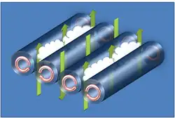 Horizontal convective rolls, also known as horizontal roll vortices or cloud streets, are long rolls of counter-rotating air that are oriented approximately parallel to the ground in the planetary boundary layer. Although horizontal convective rolls, also known as cloud streets, have been clearly seen in satellite photographs for the last 30 years, their development is poorly understood, due to a lack of observational data. From the ground, they appear as rows of cumulus or cumulus-type clouds aligned parallel to the low-level wind. Research has shown these eddies to be significant to the vertical transport of momentum, heat, moisture, and air pollutants within the boundary layer.[1] Cloud streets are usually more or less straight; rarely, cloud streets assume paisley patterns when the wind driving the clouds encounters an obstacle. Those cloud formations are known as von Kármán vortex streets.