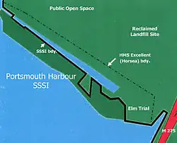 All of the undeveloped area to the southwest of the lake, with the exception of the helipad, forms one of the few terrestrial parts of the Portsmouth Harbour Site of Special Scientific Interest (SSSI) on account of its calcicole flora and fauna[5] which have flourished on the imported chalk. Notable fauna includes the small heath butterfly Coenonympha pamphilus, designated BAP Priority Species by DEFRA on account of its increasing scarcity. Horsea is also the only known habitat in Hampshire of the micromoth Eulamprotes immaculatella.[6]