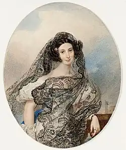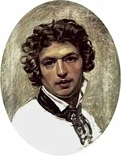 There is another important drawing known as "Portrait of Giovannina Pacini" (paper, graphite pencil, watercolor, whitewash, varnish, oval 21.1 × 17.1 cm), kept in a private collection. According to some sources, Bryullov made it in the late 1820s,[54] while others date it around 1831.[55] In 2009, this portrait was sold for £289,000 (about $456,000) at an auction of Russian art from the collection of the French gallery Popoff at Christie's.[56] However, not all researchers agree that the model was Giovannina – in some publications it appears under the title "Portrait of an Unknown".[57]