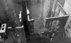 The other spaces were designed by Winold Reiss in the Art Deco style.[20] Among these was a triple-height ballroom without columns,[12][13] known as the Colorama Ballroom.[21] The ballroom measured 116 by 136 feet (35 by 41 m)[6] and had a ceiling measuring either 31 feet (9.4 m)[21] or 33 feet (10 m) high.[6] The ballroom had a black floor, white walls, a white ceiling, and multicolored reflectors operated by a "color organ"; the illuminated reflectors provided all of the room's decoration.[22] Four double trusses, each weighing 150 short tons (130 long tons; 140 t), supported the weight of the tower above the ballroom.[23]