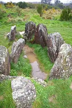 This is one of the rare funerary coffers under a tumulus in a region where tombs of the same period usually have covered passages.[8] It was excavated from 1982-1983.[9] The tumulus that covered the coffer was made up of small stones held in place by slabs, 80 centimetres (2.6 ft) to 1.6 metres (5.2 ft) long, driven diagonally at an angle of 45°[10] about 15 centimetres (6 in) into the ground.[8] The actual coffer is surrounded by 12 red schist slabs delimiting a funerary chamber 2.9 metres (9.5 ft) long by 1.5 to 1.6 metres (4.9 to 5.2 ft) wide[11] and not exceeding 1.4 metres (4.6 ft) high.[12] It must have been covered by other slabs which have since disappeared,[10] having been destroyed by treasure hunters.[4]