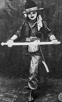 The majority of the films produced by Huaju were in the wuxia genre,[1] with elements of adventure and detective fiction.[6] Many drew from serial dramas and Westerns.[17] Most starred Zhang Huimin and Wu Suxin.[1] Generally, its main characters were presented in modern attire and dealt with modern technology.[6] Several of the films featured leading lady Wu Suxin portraying characters who passed as men, and in this capacity establishing a partnership with a male warrior while also drawing a woman's romantic affections.[18]