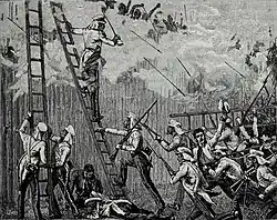 In March 1852 Fraser was appointed Commanding Engineer during the Second Anglo-Burmese War.[4] He distinguished himself at the attack on Rangoon on 12 April 1852. General Godwin in his official despatch stated, 'Major Fraser took the Ladders to the Stockade most gallantly, and alone mounted the defences of the enemy, where his example soon brought around him the storming party, which carried the Stockade; but at very severe loss on our part.' [5]'The conspicuous gallantry of Major Fraser commanding the Engineers and his indefatigable exertions since the expedition was resolved upon, more especially in the field, commanded the highest praise and the best thanks of the Supreme Government.' [6] He remained in Burma for the next two years during which he supervised extensive building work and was later described as the 'Grand Architect of Rangoon'.[7] For his services in Burma he was created a Companion of the Order of the Bath and promoted to Brevet Lieutenant-Colonel.[8]