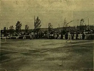 It is the fourth oldest tennis tournament of the world, which is held annually since its establishment. The first championships entitled as the Hungary's Lawn Tennis Championships were arranged on June 16, 1894, in Balatonfüred by the Stefánia Yacht Club.[1] It was a coeducated tournament thus the first "men"'s singles trophy was awarded to Austrian countess Paulina von Pálffy.[2] The next year the women's roster was distinguished and the men's, women's doubles and in 1909 the mixed doubles were added.[3] In 1899 the tournament moved to Budapest and was organized by the Budapest Lawn Tennis Club.[4] In 1903 the first unofficial international competition was held and subsequently became a standalone championship.[5] In 1907 the Hungarian Lawn Tennis Association was formed as a subsidiary of the Hungarian Athletics Club thus the latter's name was included as the Annual HAC Tennis Championships (later the governing body was shortened to Hungarian Tennis Association).[4] The hard court came into use when the National Indoors Championships were distinguished in 1927 (fedett pályás ob).[6] The same year red clay was introduced as a new surface beside the already existing grass courts.[6] Traditionally the winner of the outdoors championships is considered the Hungarian (National) champion. In the beginning the tournament accepted foreign entries but after 1924 the Hungarian International Championships served as a diverse event while only Hungarian players could possibly go for the national title.[7] After World War II the international branch went defunct and only the nationals were held. Thus this tournament did and does not qualify as an open on ATP standards and no points are awarded for the results. The location of the event is determined each year, which allows several clubs and cities to host it outside the capital Budapest including Pécs,[8] Szeged[9] and Hódmezővásárhely.[10] The date also varies to fit the schedule of other events but to be suitable for open air playing thus it takes place between May and end of September.
