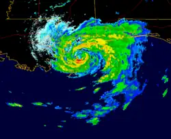 Heavy rain and winds buffeted many parishes located east of the city of New Orleans.[2][5] A small radius near the center of the storm had much of the extreme rainfall, and limited the flooding, which could have been disastrous if it were widespread.[2][7] Grand Isle and portions of the lower Plaquemines Parish were the worst hit in Louisiana. Additionally, Grand Isle reported a wind gust of 100 mph (160 km/h) and a storm surge of 5.2 feet (1.6 m).[7] At New Orleans International Airport, sustained winds of 28 mph (45 km/h) and gusts of 33 mph (53 km/h) were reported on July 19.[8] A gauge reported a water level of 4.85 feet (1.48 m) in Venice. Storm tides were 2 to 3 feet (0.61 to 0.91 meters) above normal on average.[7]
