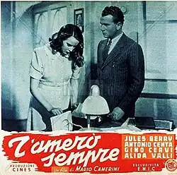 I'll Always Love You (Italian: T'amerò sempre) is a 1943 Italian romantic drama film directed by Mario Camerini and starring Alida Valli, Gino Cervi, Antonio Centa and Jules Berry. It was shot at the Cinecittà Studios in Rome. The film's sets were designed by the art director Gastone Medin. It is a remake of the 1933 film of the same title.[1][2]