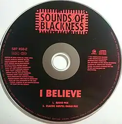 "I Believe" is a song by American vocal and instrumental ensemble Sounds of Blackness. It was produced by Jimmy Jam & Terry Lewis and was written by the duo along with: Marvin R. Pierce, Ralph Middlebrooks, Eugene Marshall Jones, Clarence Satchell, Gregory Allen Webster and Walter Junie Morrison. The song was released in 1994, by Perspective and A&M Records, as the first single from the group's third album, Africa to America; The Journey of the Drum (1994). It was a number-one hit on both the US Billboard Hot Dance Club Play chart and the UK Music Week Dance Singles chart. It samples Ohio Players 1971 recording "Pain".[3]