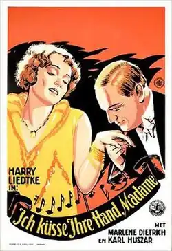 I Kiss Your Hand, Madame (German: Ich küsse Ihre Hand, Madame) is a 1929 sound German drama film directed by Robert Land starring Harry Liedtke and Marlene Dietrich. While the film has no audible dialog, it was released with a synchronized musical score with sound effects using both the sound-on-disc and sound-on-film process. [1] It was released in the United States in 1932. It was produced by Super-Film.