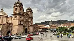 The Iglesia de la Compañía de Jesús (Church of the Society of Jesus) is a historic Jesuit church in Cusco, the ancient capital of the Inca Empire, in Cusco Region, Peru. It is situated in the Plaza de Armas de Cusco, the city center. It is built on an Inca palace.[2] It is one of the best examples of Spanish Baroque architecture in Peru. The architecture of this building exerted a great influence on the development of many Baroque architecture in the South Andes. Its construction began in 1576, but it was badly damaged in an earthquake in 1650. The rebuilt church was completed in 1673.