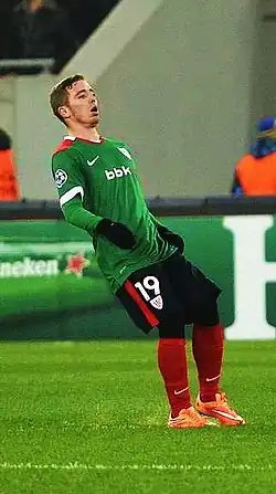 On 4 April 2015, during a game against Sevilla FC, Muniain suffered the first serious injury of his career, being sidelined for several months with an anterior cruciate ligament ailment to his left knee[30]– this meant he was unable to take any part in the year's Spanish Cup or Supercopa de España finals.[31] After suffering some setbacks in his recovery process[32][33] he returned to action on 20 December, replacing Iñaki Williams for the last minutes of a 2–0 home defeat of Levante UD.[34]