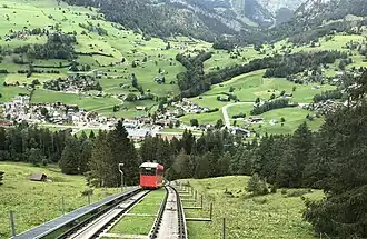 Iltiosbahn is a funicular railway in the Canton of St. Gallen, Switzerland. It leads from Unterwasser at 911 m (2,989 ft) to Iltios at 1,339 m (4,393 ft),[2] from where an aerial cableway continues to Chäserrugg (2,262 m, 7,421 ft), a peak of the Churfirsten range above Lake Walen. The line has a length of 1,195 m (3,921 ft) with a maximum incline of 27% and a difference of elevation of 428 m (1,404 ft).[2]
