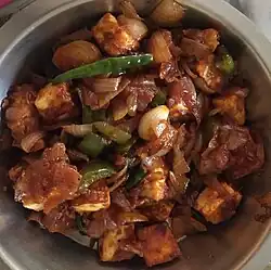 • Manchurian, generally consisting of a variety of deep-fried meats, cauliflower (gobi) or paneer with vegetables in a spicy brown sauce.[20] It is basically a creation of Chinese restaurants in India, and bears little resemblance to traditional Manchu cuisine or Chinese cuisine.[21] It is said to have been invented in 1975 by Nelson Wang; Wang described his invention process as starting from the basic ingredients of an Indian dish, namely chopped garlic, ginger, and green chillis, but next, instead of adding garam masala, he put in soy sauce, followed by cornstarch and the chicken itself.[22] A popular vegetarian variant replaces chicken with cauliflower,[20] and is commonly known as gobi manchurian. Other vegetarian variants include mushroom, paneer, baby corn, veg Manchurian.