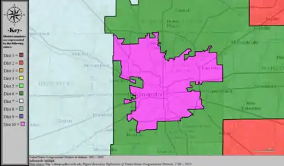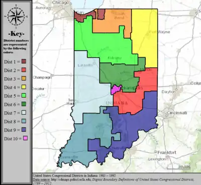 Table of United States congressional district boundary maps in the State of Indiana, presented chronologically.[3] All redistricting events that took place in Indiana between 1973 and 2013 are shown.