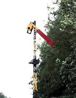 The Tebeng signaling device was the first railway signaling equipment used on Staatsspoorwegen lines since it first operated in 1878. The Krian signaling device (Dutch: Krianinrichting) was a development of the Tebeng signal, which used a tall tower equipped with locking equipment. The name of this signaling equipment is attributed to Krian Station, a railway station in Sidoarjo Regency, which was also the first station to use the signaling.[5] The last railway line to use the Krian signal was the Kalisat–Panarukan railway line, which was closed in 2004.[6] It is recorded that the Krian signal has been preserved at Krian Station, Tamanan Station,[7][6] Ambarawa Railway Museum,[8][9] and Garut Station.[10]