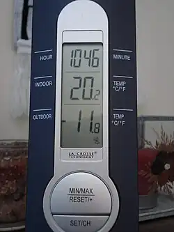 An indoor–outdoor thermometer is a thermometer that simultaneously provides a measurement of the indoor and outdoor temperatures. The outdoor part of the thermometer requires some kind of remote temperature sensing device. Conventionally, this was done by extending the bulb of the thermometer to the remote site. Modern instruments are more likely to use some form of electronic transducer.