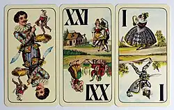 A 78-card version by Piatnik was once made to play Grosstarock (No. 1938); it was also adapted for the Austrian game of Droggn, although players used only 66 cards from the pack.[7] There was also a mysterious 73-card version from the 1930s, also by Piatnik, which was composed like the 54-card deck but with 19 more trumps.[8][9][10][11] It is believed to have been used for a lost version of Minchiate.