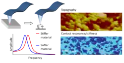 - ^ A contact resonance is a vibrational resonance frequency of an AFM cantilever that occurs when the tip of the AFM is in contact with a sample surface. When the QCL is pulsed synchronously with a contact resonance, the detection of the thermal expansion of the sample from infrared absorption is amplified by the quality factor Q of the contact resonance.