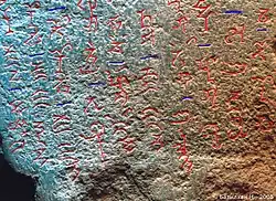 Dieter Maue, a specialist in Sanskrit and Brahmi, deciphered the Brahmi script of the inscription.[3] It was subsequently analyzed by linguist Alexander Vovin who remarked on the similarity of the HT language to mainstream Mongolic (Middle Mongolian) as opposed to the more southern Khitan language. Mehmet Ölmez elaborated on the details of the expedition while Étienne de la Vaissière provided a historian's perspective. The inscription can be safely dated to between the 5th and 7th centuries, that is in the Rouran and early Turkic period.[1] The text mentions an Anagui (Ańakay, though it's unlikely that this is Yujiulü Anagui, a Rouran khagan), and a Niri qaghan, likely Qaghan Niri since this is the only Qaghan with that name that we know of—though it's unlikely that the inscription was made for him or ordered by him.[1] If the Niri Qaghan mentioned in the inscription corresponds to the only khagan with that name that we know of, the inscription could be dated to the time of his reign (579-603/604). A Bodhi-Sattva is also mentioned, together with the title khagan. This was a Buddhist Bodhisattva, or possibly a Turkic qaɣan from the First Turkic Khaganate.[2] There was an Uighur chief at the time reportedly entitled Bodhisattva (藥羅葛菩薩; pinyin: Yaoluoge Pusa) who, however, never has the title of khagan in Chinese sources, but of xielifa.[1] Further, the lingua franca at the time was Sogdian,[1] and "probably the only trait that distinguished the Uighurs," whose khaganate was established in 744 and like their neighbors were a seminomadic people, "from the Xiongnu, Xianbei and Mongols, was their language," a Turkic one,[4] as opposed to the Mongolic language of the inscription.[2] The text might be historical, but with Buddhist overtones,[2] a religion that was quite important to the Rouran elites[1] and other steppe people.