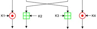 After the 8 rounds comes a final “half-round”, the output transformation illustrated below (the swap of the middle two values cancels out the swap at the end of the last round, so that there is no net swap):