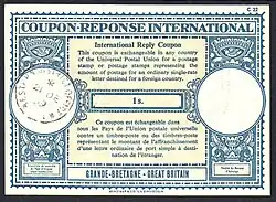 International reply coupons[1] (in French, Coupons-Réponse Internationaux) are printed in blue ink on paper that has the letters "UPU" in large characters in the watermark. The front of each coupon is printed in French. The reverse side of the coupon, which has text relating to its use, is printed in German, English, Arabic, Chinese, Spanish, and Russian. Under Universal Postal Union regulations, participating member countries are not required to place a control stamp or postmark on the international reply coupons that they sell. Therefore, some foreign issue reply coupons that are tendered for redemption may bear the name of the issuing country (generally in French) rather than the optional control stamp or postmark.