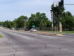 Iowa Highway 163 begins at the corner of E. 14th Street, which carries U.S. Highway 69 (US 69), and E. University Avenue in Des Moines. It heads east along E. University traveling 3⁄4 mile (1.2 km) to Interstate 235 (I-235).[1] There is no direct access to eastbound I-235 from eastbound Iowa 163. Traffic must take E. 21st Street to Easton Boulevard to access eastbound I-235. Highway 163 continues east past the Iowa State Fairgrounds on its way to Pleasant Hill where it meets U.S. Highway 65 at a diamond interchange.