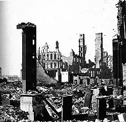 Within the Moody–Sankey mission, Moody preached and Sankey sang. Late in 1871, mission work was interrupted by the Great Chicago Fire, which destroyed 18,000 buildings, killed around 300 people, and left a third of the city's population homeless.[10] Sankey watched the conflagration from a small boat in which he rowed out into Lake Michigan.[11] The fire destroyed Moody's church, and Sankey returned temporarily to New Castle. However, he soon received a message from Moody asking him to come back to Chicago and resume the partnership.[7] He did so and worked with Moody in the revival of churches in Chicago, Springfield and elsewhere.[3] In October 1872 Sankey moved his family permanently to Chicago.[7]