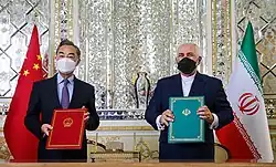 ![]() Chinese foreign minister Wang Yi (left) and Iranian foreign minister Mohammad Javad Zarif (right) after signing off on the cooperation program in Tehran | |